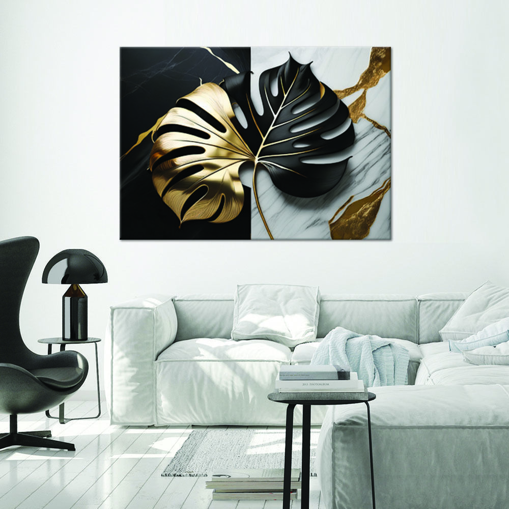 Leinwandbild, Monstera Gold und Schwarz auf weißem und schwarzem Hintergrund